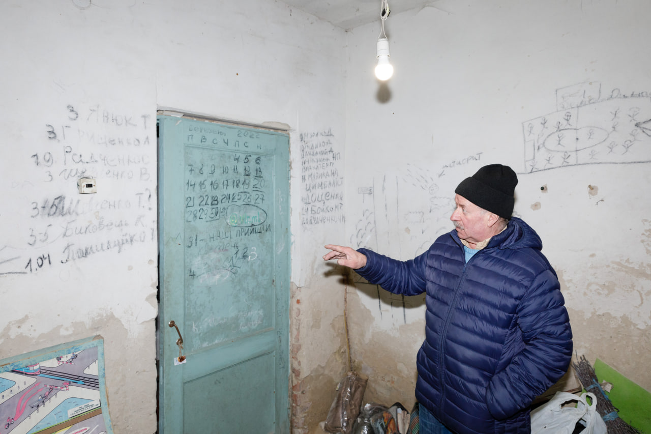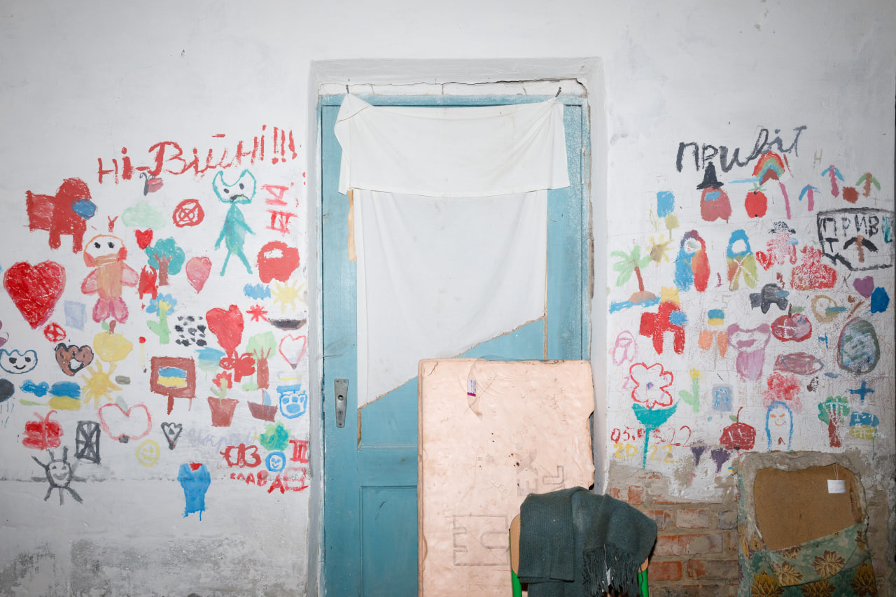 Підвал стоїть сирим, якщо не сказати мокрим. На речах і стінах – пліснява. Вона підбирається до дитячих малюнків, які діти виводили у полоні: сердечка, котики, синьо-жовті прапорці і слова «Ні війні». Поряд з ними дорослі креслили свої імена, записували дати смерті сусідів і вели календарі.